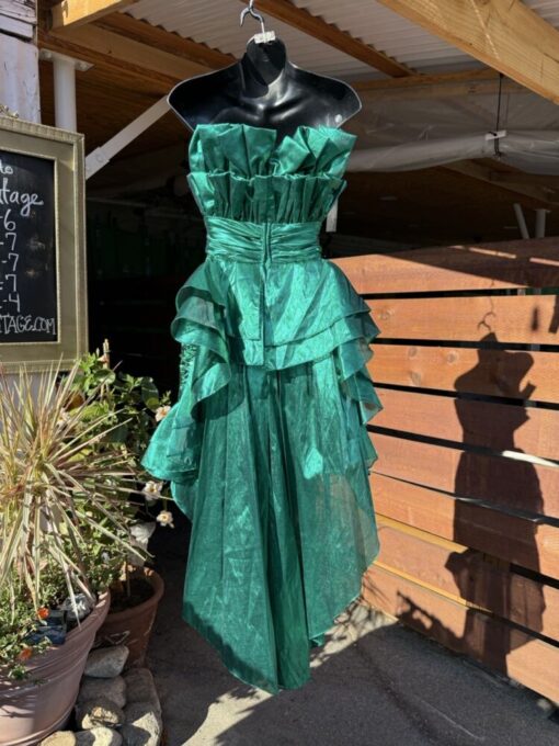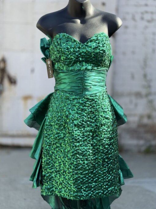 By Night Moves- Vintage 1980s Glam Shiny Green Lame Strapless Sequins Dress. Inside boning at bodice for support. Ruching at waist and tiered bustle train at back