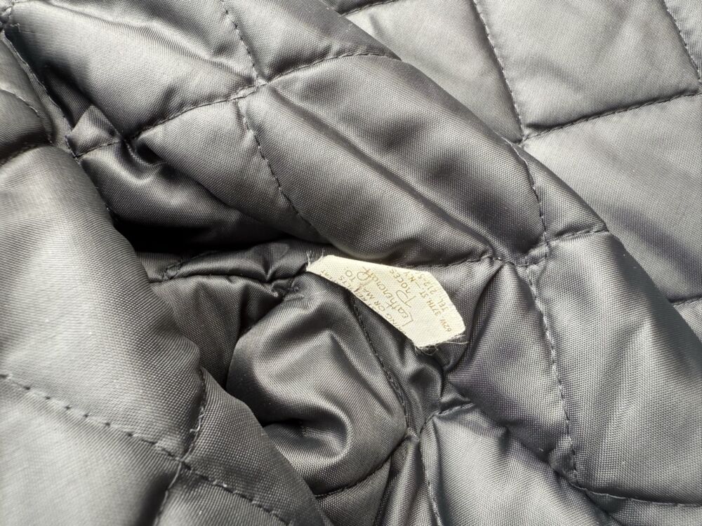 Features quilted lining, Heavy duty zipper closure, 4 front pockets, 1 lining pocket, zip vent sleeves, belt hem, and upper collar snaps. Made in USA/ Size 48, US L