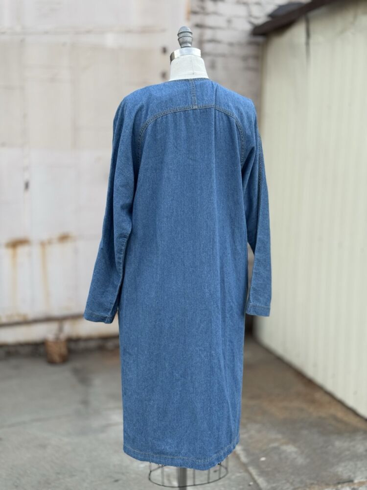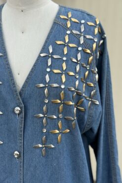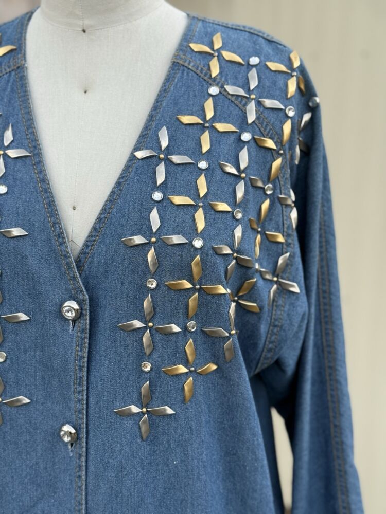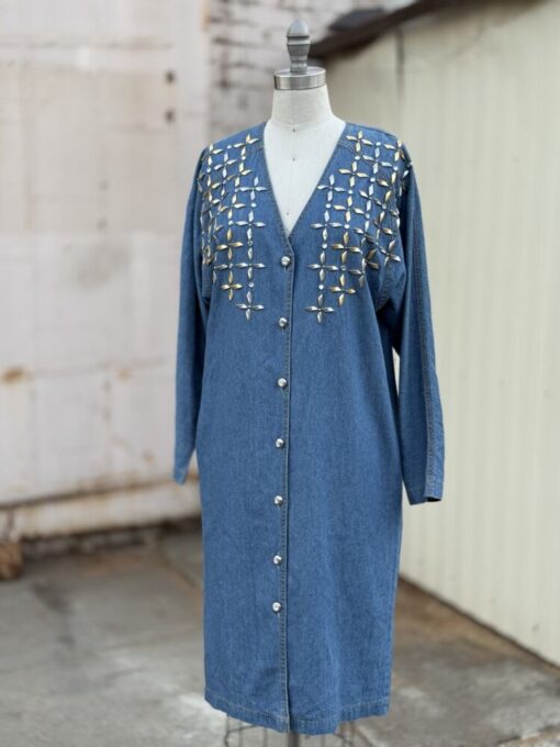 90s Long Denim Jacket Embellished with Gold Tone Studs and Crystal Beads, by Monique Fashions. Has Two Side Seam Pockets. Labeled Size 4, Will Fit S-M