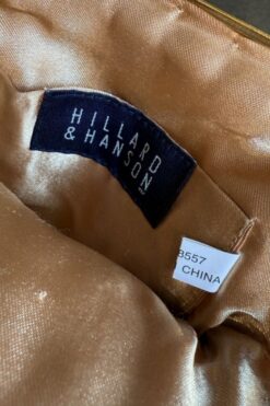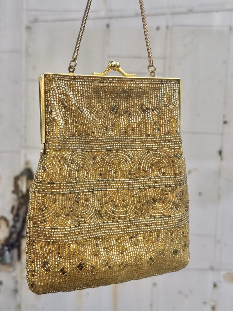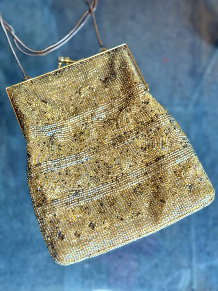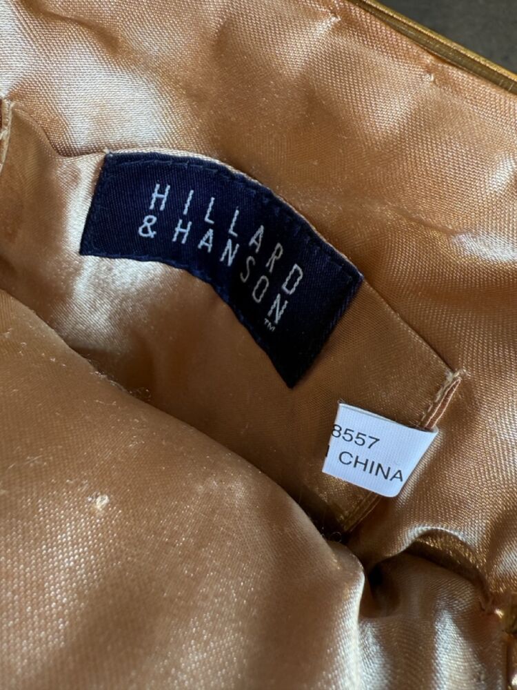 1990s Hillard and Hanson Golden tone beaded clutch. Features chain strap and satin lining