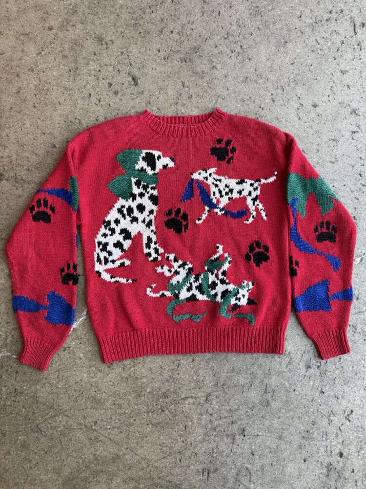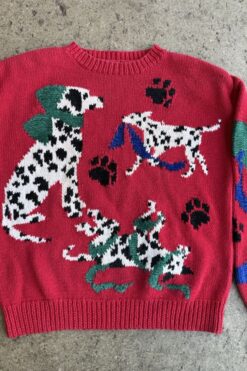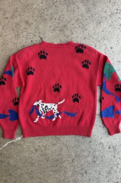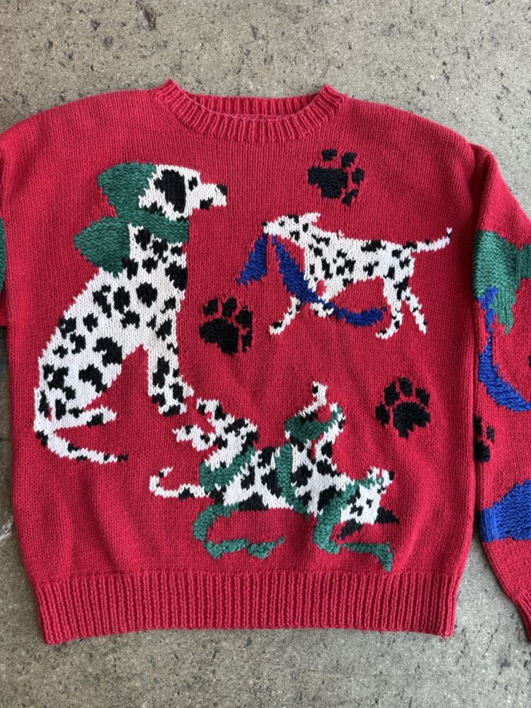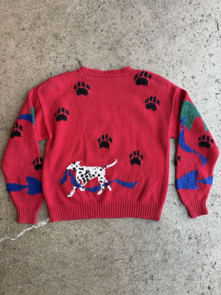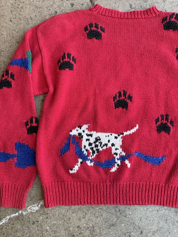 Handknit Chunky Yarn Dalmatian Sweater by Talbots (90s). Body is Red Cotton Yarn and Features Wonderful Scene of Dalmatians Playfully Running. Detailed with Paw Prints and Green and Blue Chenille Yarn