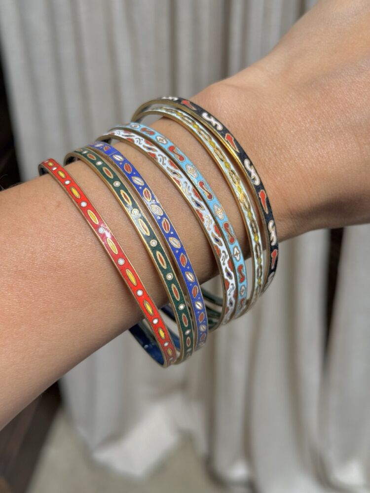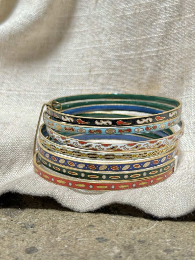 Set of Vintage Enameled Brass Bangles. Connected together with Clip and Ringlet