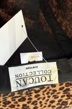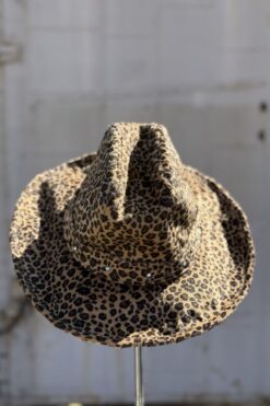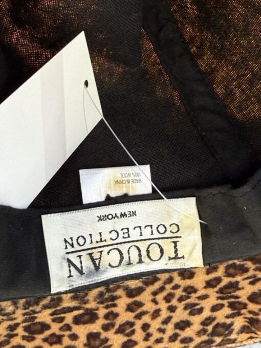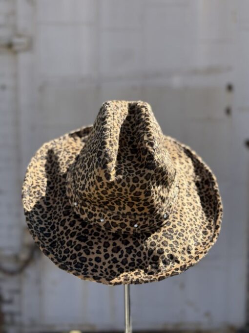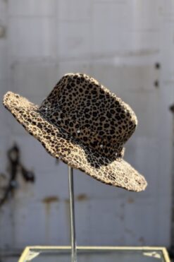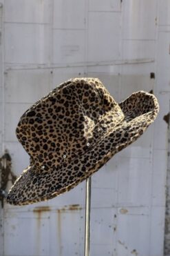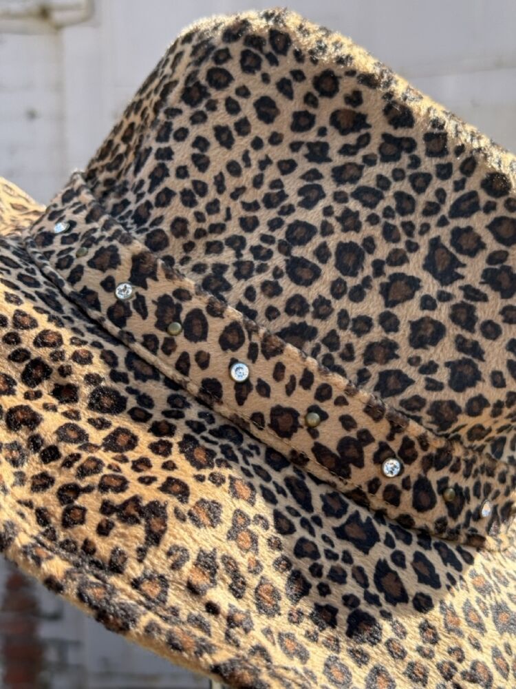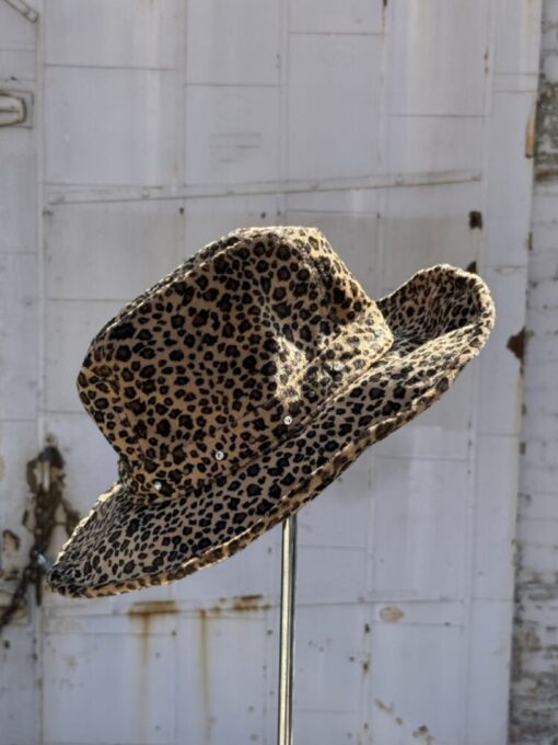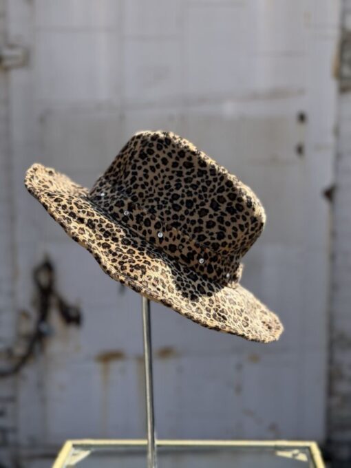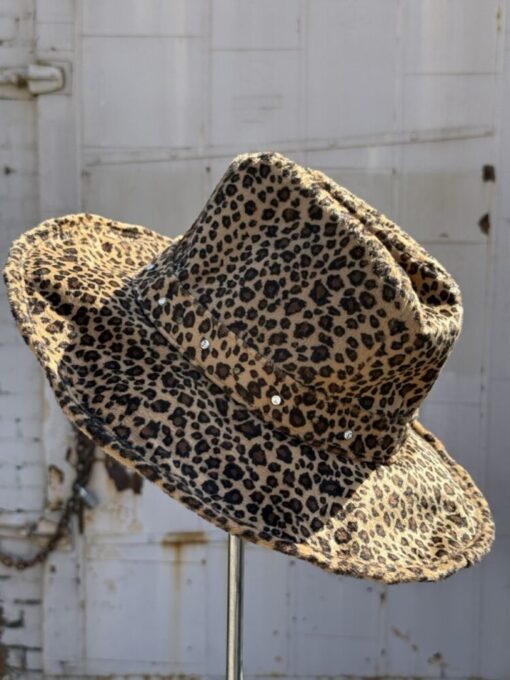 Vintage from 90s or 2000s. Adjustable Wire Brim Cowboy Hat by Toucan Collection. 100% Wool With Cheetah Print, Rhinestone and stud detailing along base.