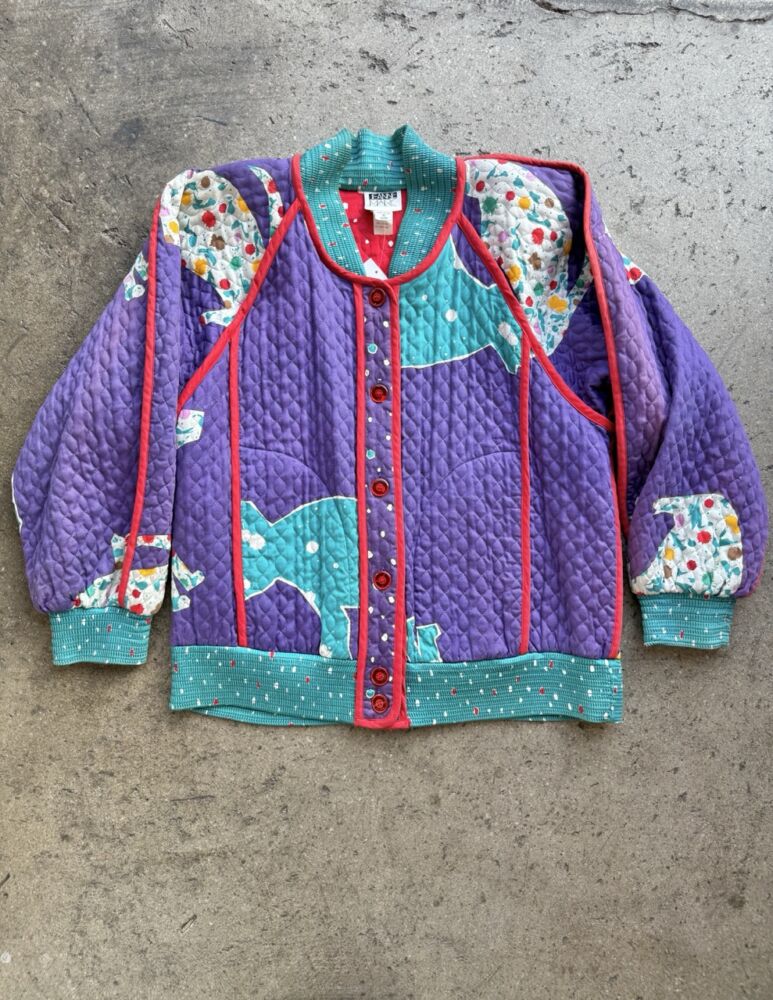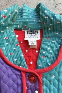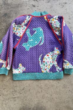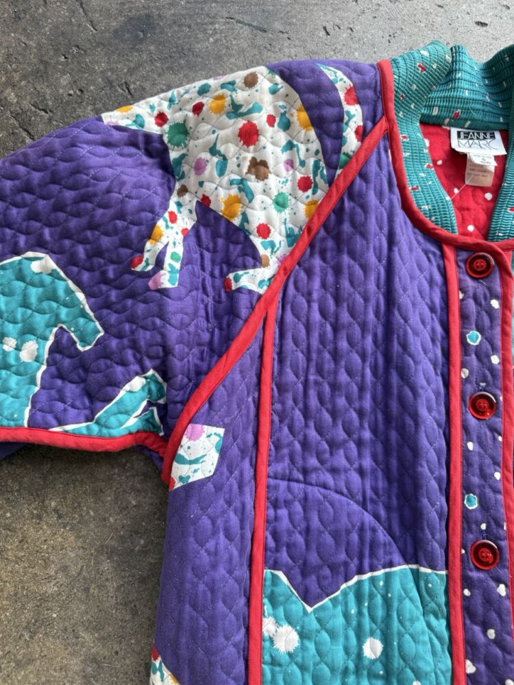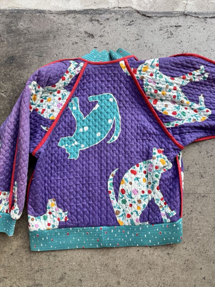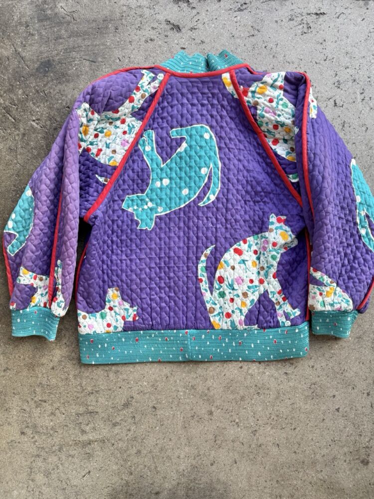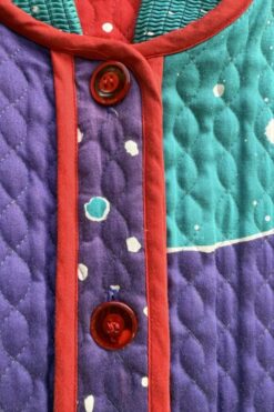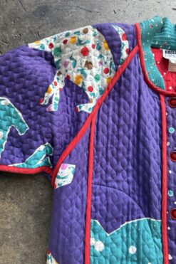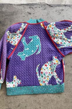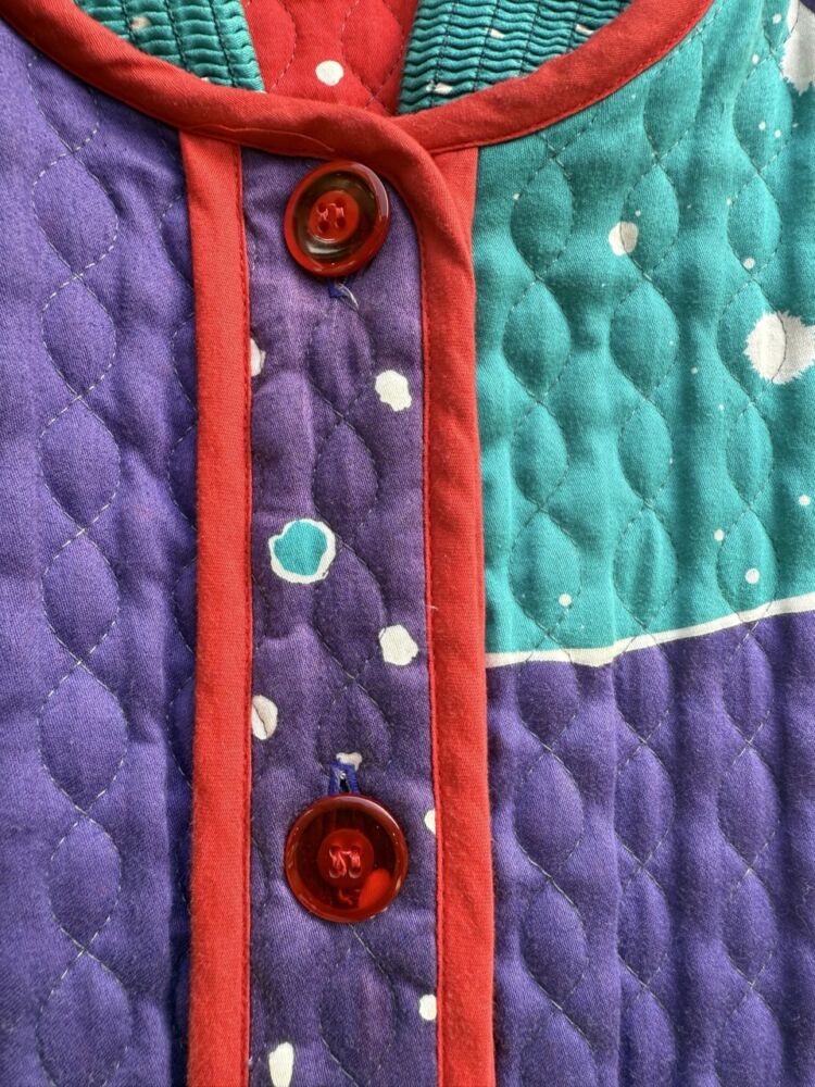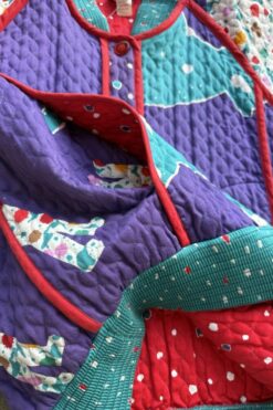 Colorful Dog Print Pattern, with Contrast Red Piping, and Red Tinted Clear Buttons. Two front Pockets