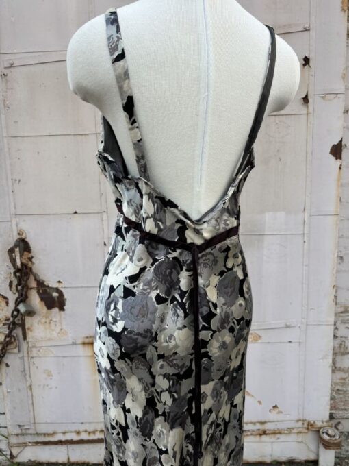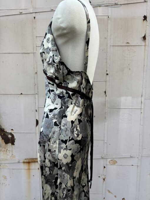 Dreamy ’90s does ’30s Betsey Johnson bias-cut dress in moody grey-scale watercolor floral print. Deep v-neck bodice with plunging back and waist tie.