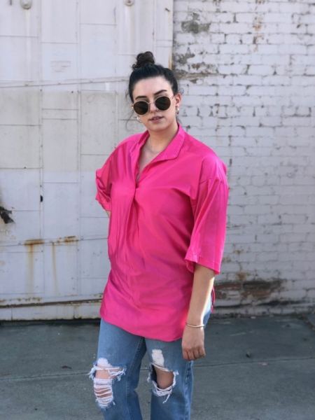 Quintessential ’80s top in shocking pink! With shirttail hem and elbow-length sleeves perfect for rolling.