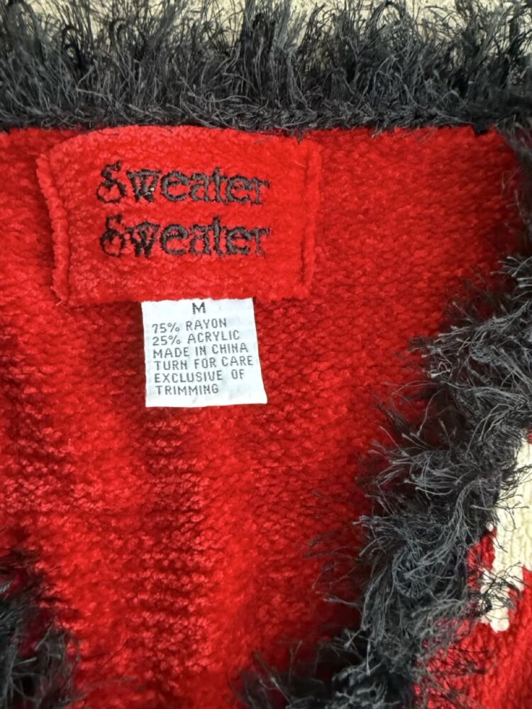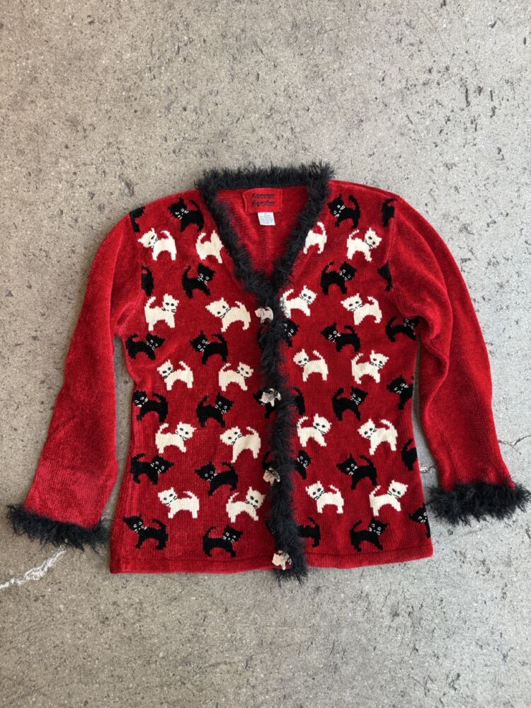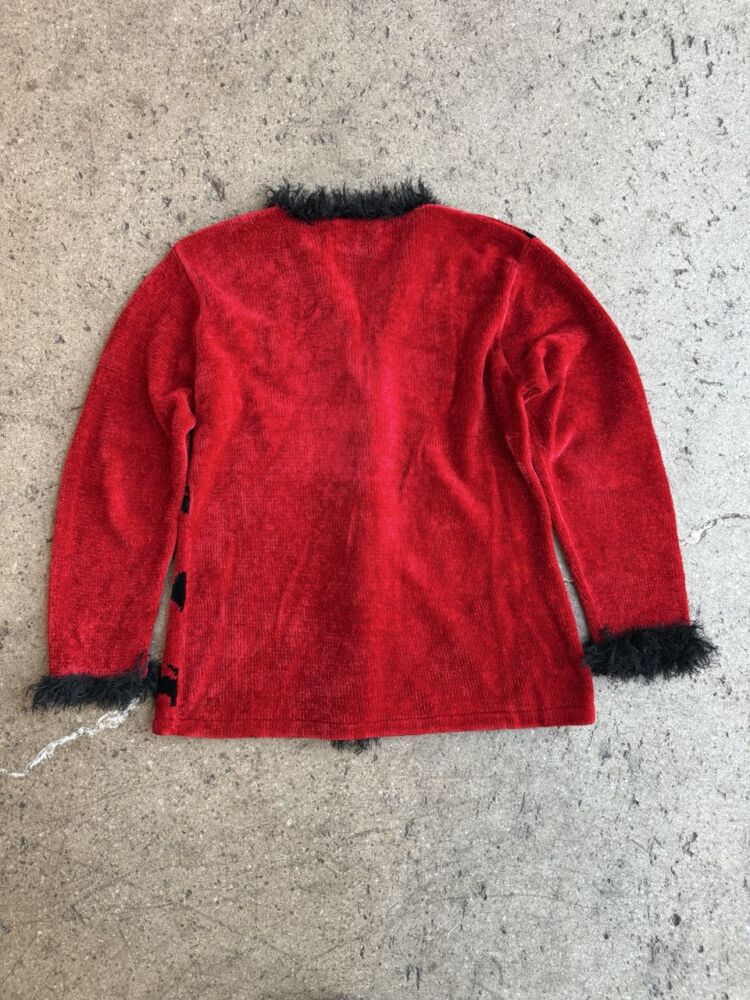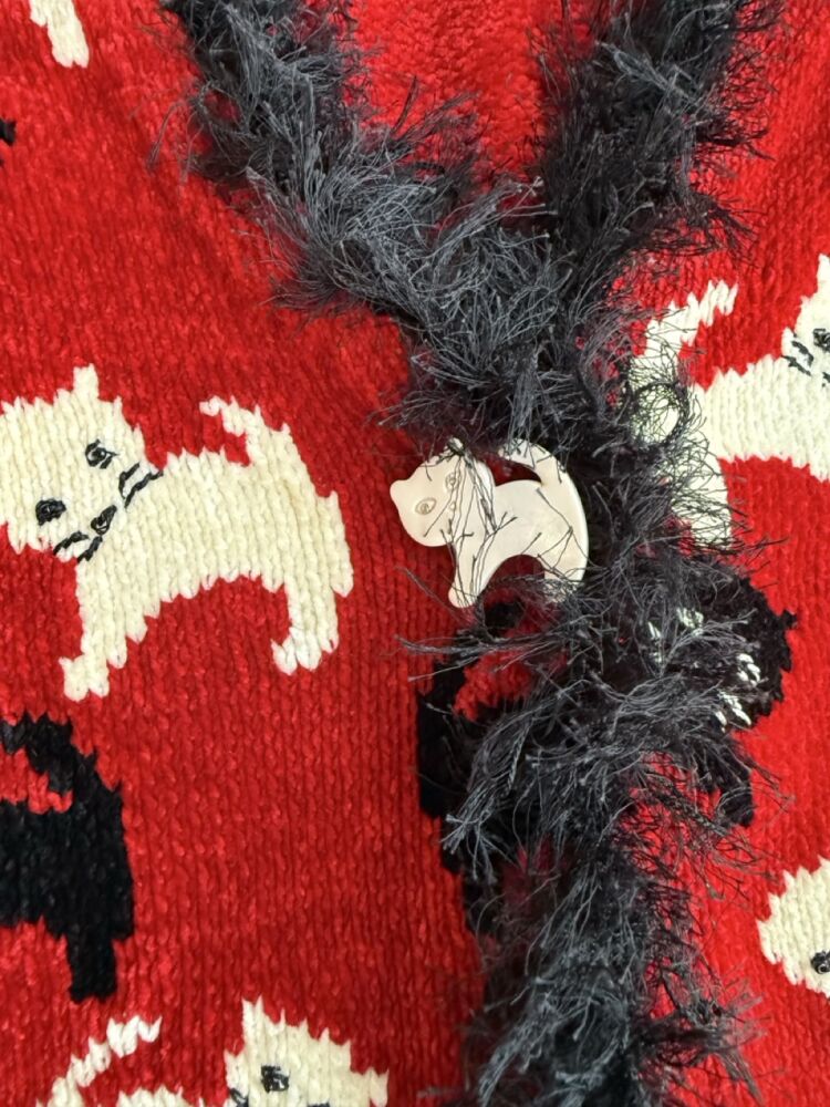 Red Knit Cat Sweater with black fringe trim and acrylic cat buttons with rhinestone eyes.