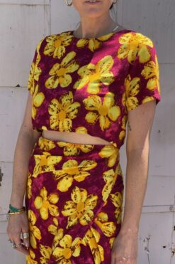 Super cool ’90s two-piece set: cropped ‘baby-tee’ style top and high-waisted wrap skirt, with sunny yellow and orange daisies on a tie-dyed jewel red background.
