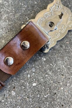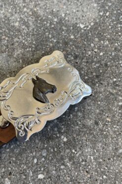 One for the kiddos! Cool hand-tooled leather belt by Wrangler with bright silver horse head buckle.