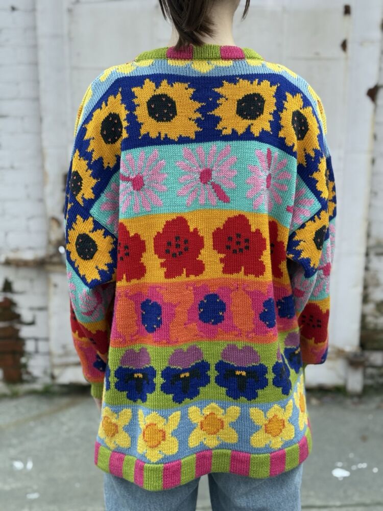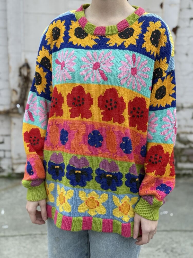 Chunky weight knit sweater, features colorful pattern of flower motif stripes