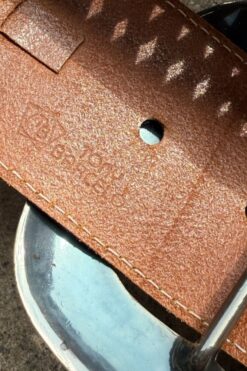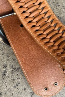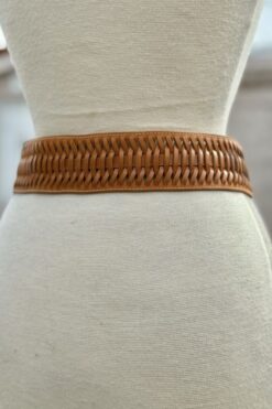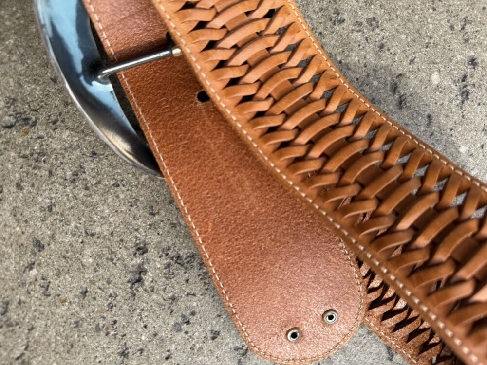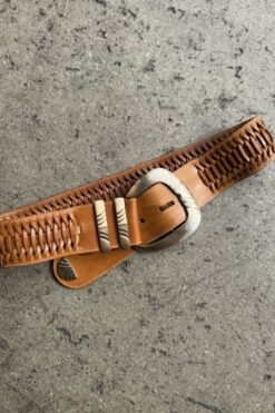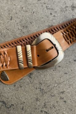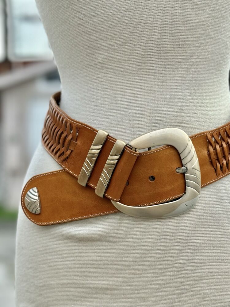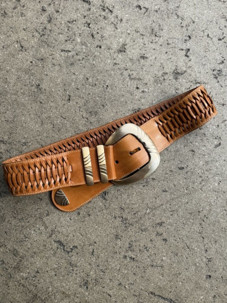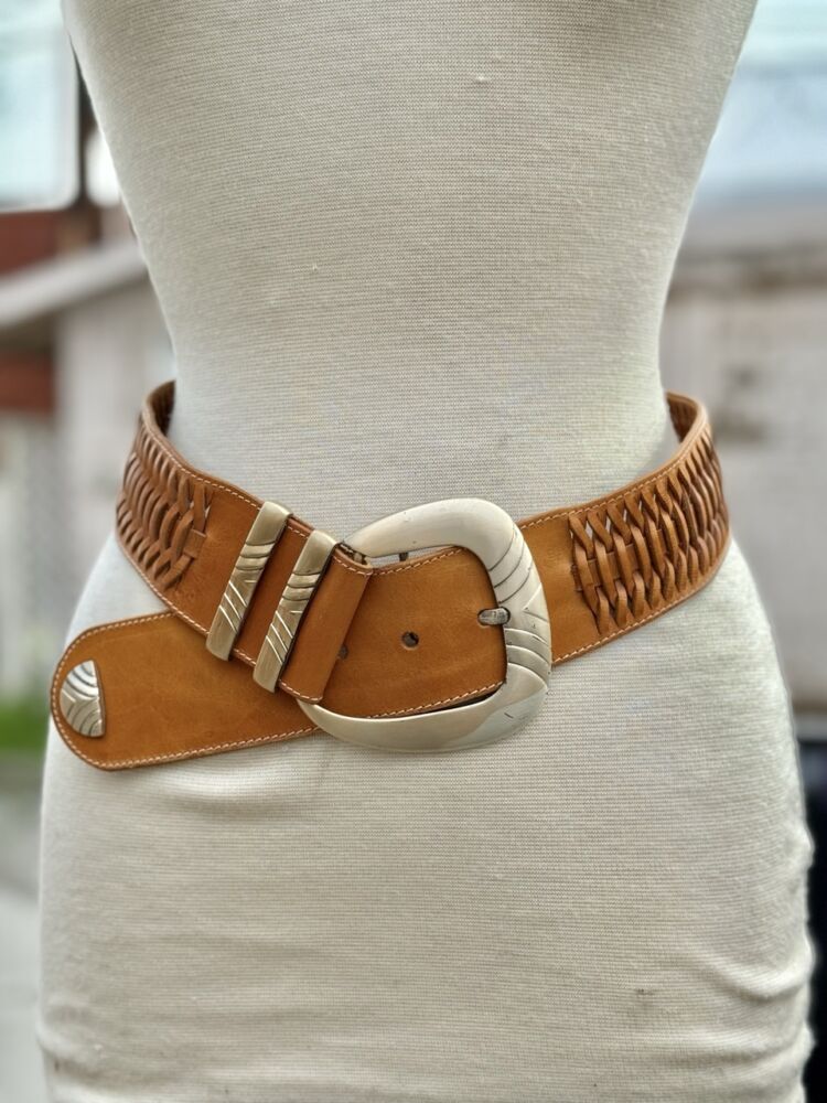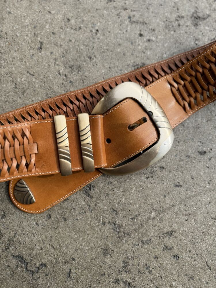 Vintage Tony Barcelo Woven Leather Belt with Large Metal Buckle. In excellent condition, minor markings visible on buckle. Can be worn lower on hip