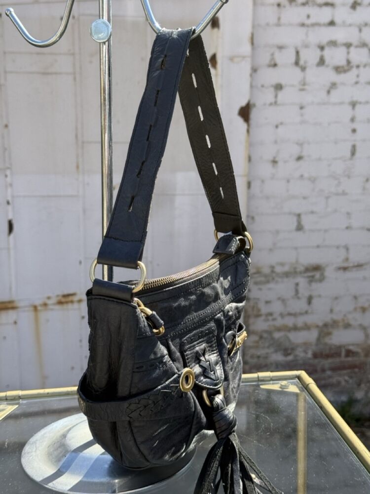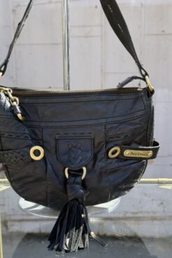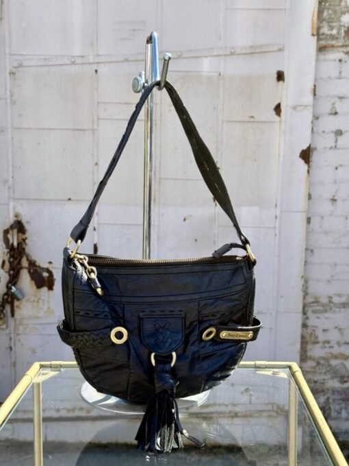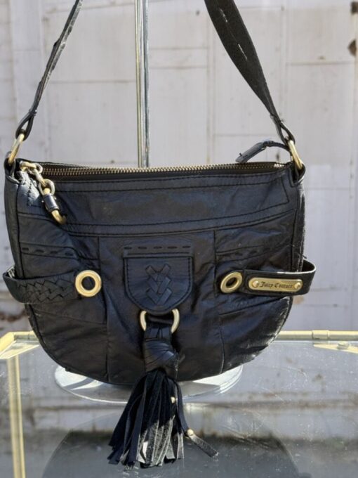 Vintage from Y2K Era Juicy Couture Black Leather Shoulder Bag Purse. Features Gold Tone Grommet Hardware, Lining Zipper Pouch, Studded Tassel Charm, and Juicy Logo Zipper Charm.