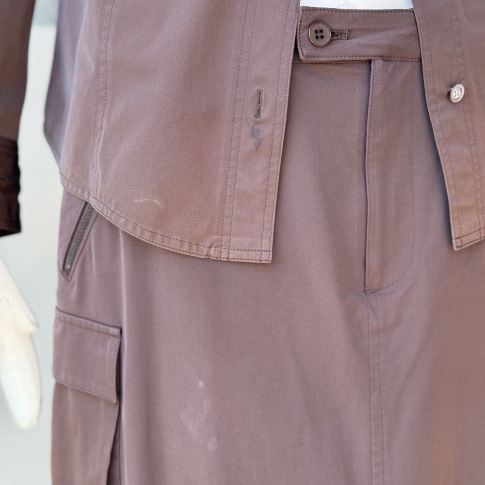 Vintage from the 2000s Yoshie Inaba uniform set. Cut in a soft mideweight technical nylon fabric. Maxi skirt with cargo pockets and two zipper pockets. Button up shirt with epaulet detail and mother of pearl buttons.